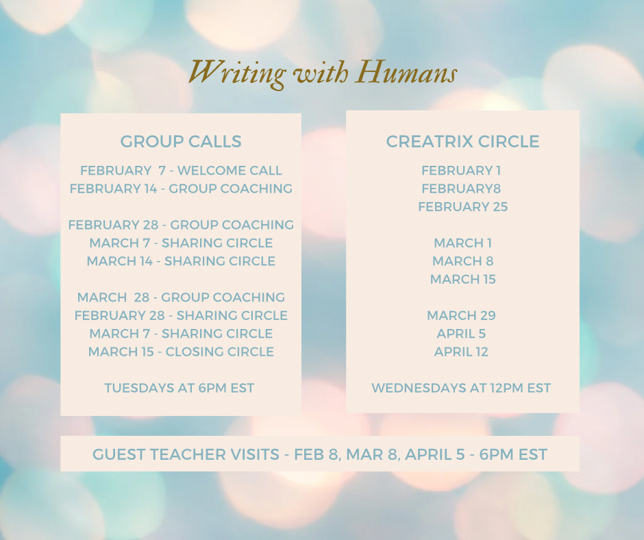 While you’re in Writing with Humans you’ll benefit from membership in Creatrix Circle. Creatrix Circle meets three Wednesdays a month for 2 hours of creative coworking over Zoom. In Creatrix Circle, we normalize showing up for our creativity. You’ll be surrounded (virtually) by other humans showing up for their writing and you’ll realize it’s the most natural thing.